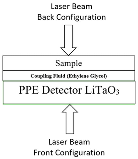 The photopyroelectric method is generally based on pyroelectric detection [20]. The experimental setup consisted of a 300 mW blue diode laser with electrical modulation and an output wavelength of 405 nm. A dual–phase lock–in amplifier (SRS 830) and a 0.5 mm–thick (lithium tantalite oxide crystal) LiTaO3 detector were used. The pyroelectric sensor was coated with opaque electrodes (Cr+Au) to absorb the incident light. In this technique, the measuring setup largely determines when the excited radiation falls on the sensor or the sample. The back configuration is when the laser directly excites the specimen, generating heat that travels through the plate and is sensed by the detector (Figure 2). The measurements in this situation yield the thermal diffusivity [20].