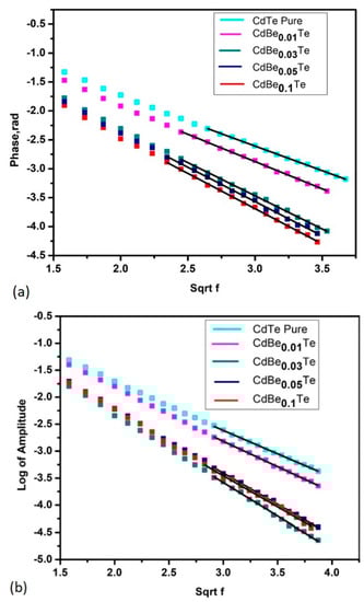 Phase (a) and amplitude (b) characteristics of CdBeTe crystals for front configuration as a function of the modulation frequency. Squares refer to experimental points, and lines are the best fits of Equations (7) and (8) performed with the least square method.