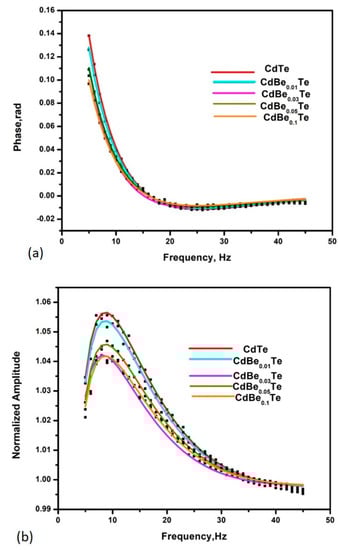 This is to mention that only one unknown parameter was searched, namely the thermal effusivity of the solid sample. All others parameters were taken from the literature or measured. Both the phase and amplitude were normalized by applying the empty sensor procedure. For all CdBeTe samples, the behavior of the phase and the amplitude are similar. In the spectra presented in Figure 4, one can see the phase drop quickly, and then some broad minimum is observed.