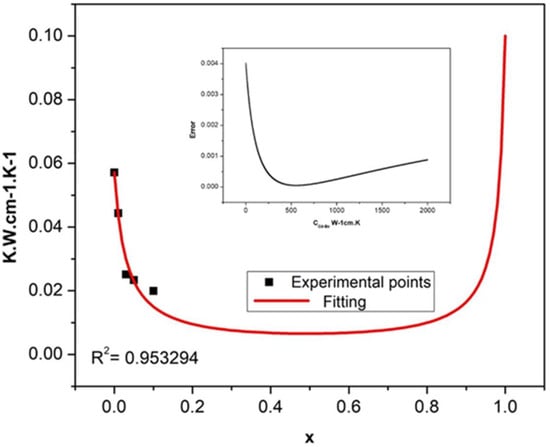 The starting and end parts of the curves are essential and symmetrical; on the other hand, there is a plateau in the middle. Thanks to that, one can obtain seeking parameters with reasonable accuracy, even if we do not have data in the whole composition range. The fitting presented in Figure 5 allowed us to determine the value of the additional thermal resistivity which is connected with the chemical disorder. It was determined as 474 W−1·cm·K with the statistical determination coefficient of 0.953294. The error graph arising from the least square approach is presented in the inset of Figure 5.