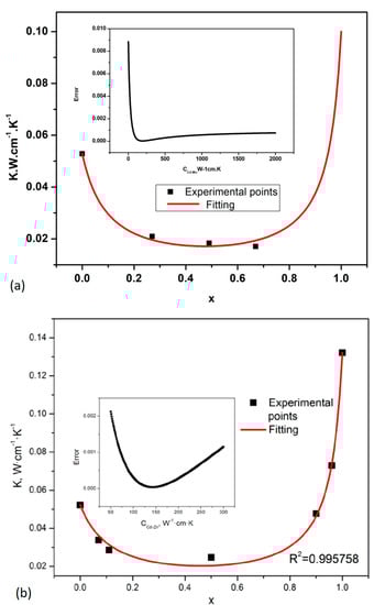Thermal conductivity curve versus composition for CMT (a) and CZT (b) mixed crystals. The points are the experimental data, and the line is fitted and obtained using Equation (14). The error graphs from the least square approach are presented in the inset.