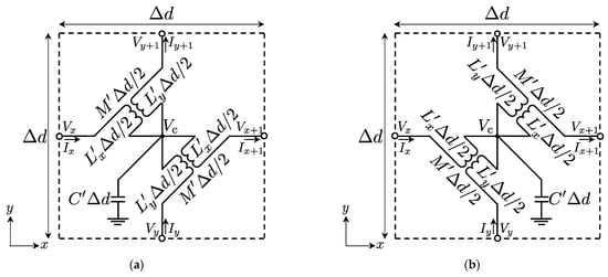 Firstly, we recall the theory of 2-D equivalent circuit models for full-tensor anisotropic acoustic metamaterials (see Figure 1a,b) [] and show the relations of material parameters and circuit parameters. According to the references of [,,], defining the voltage and current vectors and the 2-D equivalent circuit models of Figure 1a,b as V = [Vx, Vx+1, Vy, Vy+1] and I = [Ix, −Ix+1, Iy, −Iy+1], we can obtain those circuit equations as shown in the left column of Table 1 from Kirchhoff’s voltage and current laws. On the other hand, Maxwell’s equations and acoustic equations in the 2-D Cartesian coordinate system with z invariance can be written as in the center and the right columns of Table 1 by assuming z-polarized TE waves or acoustic waves in a full-tensor anisotropic metamaterials and time harmonic variation, respectively. Then, considering the correspondences of voltages, currents, electric fields, magnetic fields, scalar pressures, and fluid velocities, as shown in Table 2, we can obtain the following relations [,,] between the circuit parameters per unit length (L′x, L′y, M′, and C′), the parameters of electromagnetic metamaterials (μxx, μxy = μyx, μyy, and εz), and the parameters of acoustic metamaterials (ρxx, ρxy = ρyx, ρyy, and K′):
