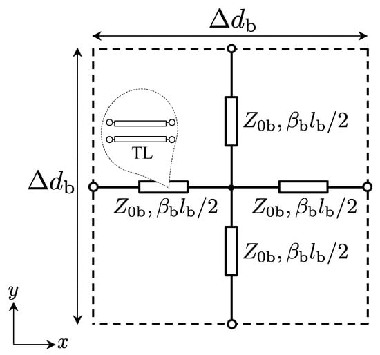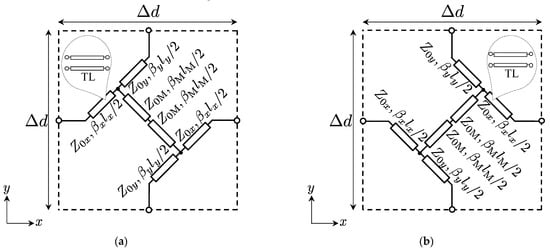 In the field of electromagnetic waves, design methods with equivalent circuit models based on the transmission-line approach [] have been adopted to designs of electromagnetic metamaterials since the approach can abstract Maxwell’s equations and leads to physical insights and rigorous designs. In particular, these have widely been used for the designs of electromagnetic metamaterials having negative refractive index characteristics [,,,,]. Furthermore, two-dimensional (2-D) equivalent circuit models for full-tensor anisotropic metamaterials [,] have been proposed and have been introduced to the design of metamaterials based on the concept of transformation electromagnetics [] that can realize invisible cloaks [,,,,,,,,,,,,,], carpet cloaks [,,,,,,,,,,], and illusion media [,]. Those lumped circuit elements independently correspond to the permittivity and the permeability tensor components and, therefore, the models can rigorously design the unit cells of the full-tensor anisotropic metamaterials without resorting to many calculations by simulators that are one of the issues in the conventional design methods. The broadband operations can also be achieved due to the intrinsic nature of non-resonant. Furthermore, 2-D distributed transmission-line (TL) models have been proposed []. The characteristic impedance and the line length can be determined uniquely by substituting the lumped circuit elements in the 2-D equivalent circuit models for the design formulas and, therefore, we can easily implement metamaterials based on transformation electromagnetics with planar structures. The validity and the usefulness have also been demonstrated experimentally [,].