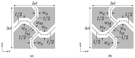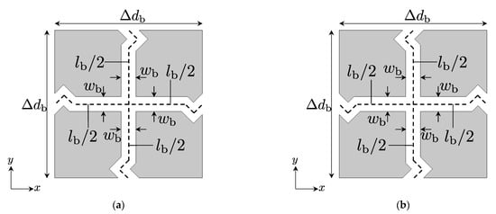 Figure 3a,b shows the proposed 2-D acoustic waveguide unit structures for full-tensor anisotropic acoustic metamaterials and Figure 4a,b is for the background medium to be connected to Figure 3a,b, respectively. Furthermore, these waveguides are formed in the rigid body and are filled with the air. wx, wy, wM, and wb are the waveguide widths, l (=lx = ly), lM, and lb are the waveguide lengths, and Δd and Δdb (=Δd) are the waveguide unit cell lengths. The waveguide widths can be determined as the following formulas: