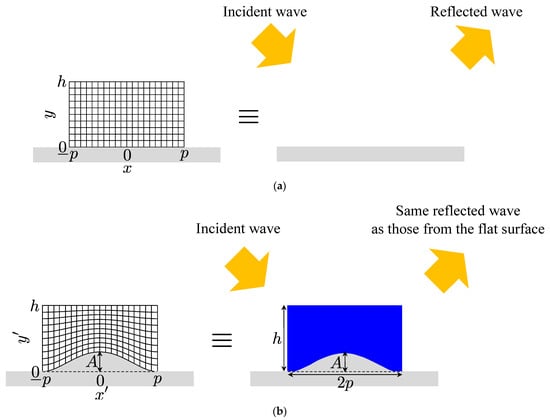 Here, we design an acoustic carpet cloak for hiding a bump on a flat surface of Figure 6 [] and an acoustic illusion medium for mimicking a groove on a flat surface of Figure 7 [] to show the design examples with the proposed unit cell structures in the previous subsection. Incidentally, materials of the flat surface, the bump, and the groove are assumed to the rigid body in the following design.