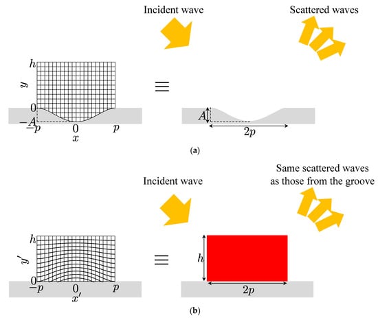 Concept of an illusion medium. (a) Original coordinate system on a groove and scatterings of the incident acoustic wave by the groove; (b) transformed coordinate system on a flat surface and scatterings of the incident acoustic wave from an illusion medium on the flat surface. The same scattered waves as that from the groove are generated by controlling the trajectory of the incident acoustic wave with the illusion medium and it looks like as if there is the groove on the flat surface.