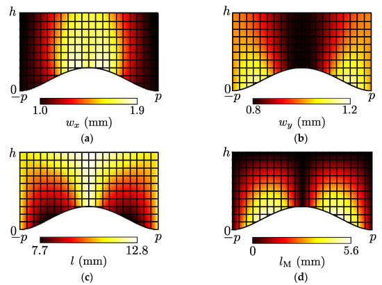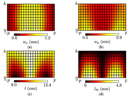 Calculated results of the waveguide widths and lengths for the acoustic illusion medium (wM = 0.667 mm). (a) wx; (b) wy; (c) l; (d) lM.