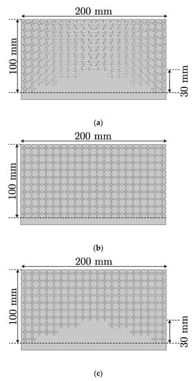 Designed acoustic carpet cloak and the additional designed structures for comparison. (a) Carpet cloak; (b) flat surface; (c) bump. These sizes are 2p × h = 200 mm × 100 mm (2p × h) and those are discretized by using unit cells of Figure 3 (carpet cloak case) and Figure 4 (flat surface and bump cases) whose sizes are Δd × Δd = Δdb × Δdb = 10 mm × 10 mm. The structural parameters of Figure 8 are adopted to the unit cells of the carpet cloak, and those for the flat surface and the bump are wb = 1.0 mm and lb = 11 mm.