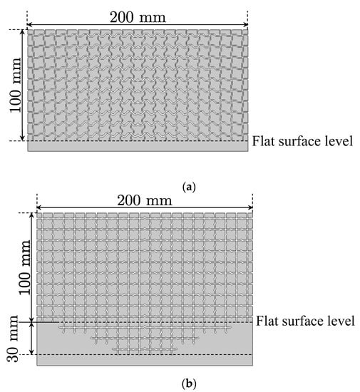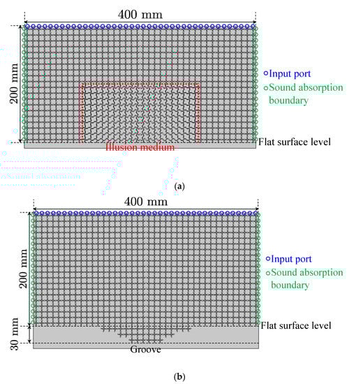 Full-wave simulation setup. (a) Acoustic illusion medium; (b) groove. The designed structures in Figure 11a,b are placed at the center of the bottom of the background medium area (400 mm × 200 mm). In the case of (b), the groove is on the lower position than the flat surface level. The bottom boundaries are set as the rigid body walls.