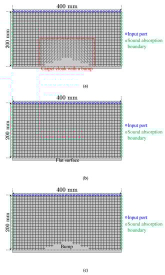 Figure 12a shows the setup for the full-wave simulations of the acoustic carpet cloak and the size of the analysis area is set to 400 mm × 200 mm. The designed carpet cloak in Figure 10a is arranged at the center of the bottom in that area, and the other area corresponds to the background medium constituted by using the structures of Figure 4. Forty input ports are connected to the waveguides of the upper boundary and a Gaussian beam with a beam waist of 100 mm is injected from there. Furthermore, the rigid body walls are set as the bottom boundary and other boundaries are selected as the absorption boundary. We calculated the complex sound pressure distributions in the waveguides by the Acoustics Module of COMSOL and compared the results with those for the cases with the flat floor in Figure 10b (see Figure 12b) and the bump in Figure 10c (see Figure 12c). Incidentally, the number of meshes in these simulations was approximately 1.4 million and the calculation time was approximately one hour.
