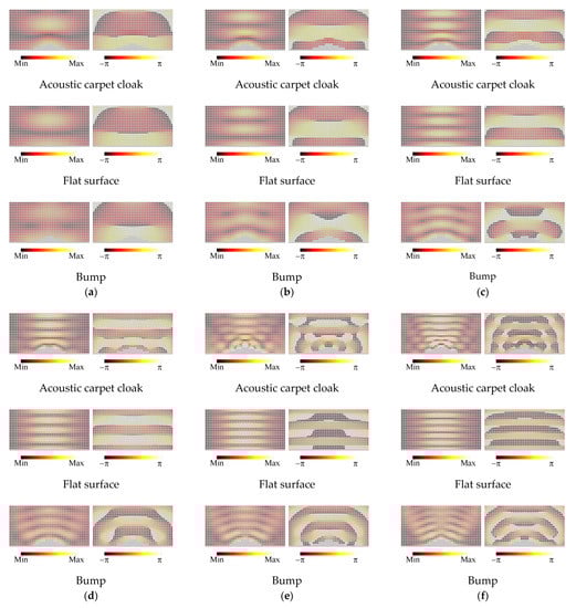 The calculated results of the amplitude and phase distributions of the sound pressure are shown in Figure 13a–f, and the frequencies are set to 1.0, 1.5, 2.0, 2.5, 3.0, and 3.5 kHz, respectively. The values of the wavelength per unit cell length (λ/Δd) are 22.3, 14.8, 11.1, 8.91, 7.42, and 6.36. It is seen from the results of Figure 13a–d that the carpet cloak can sufficiently suppress the scattered waves by the bump and mimics the flat surface. On the other hand, the level of the scattered wave becomes large in the cases of Figure 13e,f. This reason is that the influence by the discretization error becomes large due to the shorter wavelength than in the other cases. Therefore, we can conclude from the results above that the designed acoustic carpet cloak can operate at least up to 2.5 kHz (λ/Δd = 8.91).