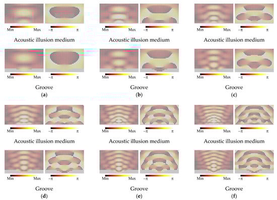 Complex sound pressure distributions for the acoustic illusion medium and the groove. (a) 1.0 kHz (λ/∆d = 22.3); (b) 1.5 kHz (λ/∆d = 14.8); (c) 2.0 kHz (λ/∆d = 11.1); (d) 2.5 kHz (λ/∆d = 8.91); (e) 3.0 kHz (λ/∆d = 7.42); (f) 3.5 kHz (λ/∆d = 6.36). Left: Amplitude. Right: Phase.