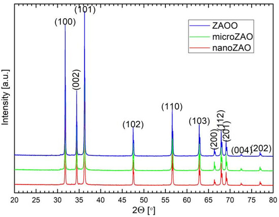 It should be noticed that the proposed mechanism which relies on the increase in charge carrier concentration could be debatable, taking into account the measured values of the optical band gap (Table 1), which are essentially similar for all the samples. Still, these values were obtained at ambient temperatures, where, indeed, the electrical conductivity of the ZAOO and nanoZAO samples converge, while still demonstrating the high electrical conductivity of microZAO sample, could be attributed to the effects imposed by the measuring route from high to low temperatures. The low-temperature trapping of the charge carriers at the grain boundaries [44] and competing band gap widening due to the Burstein–Moss effect and its narrowing due to approaching the Mott critical density of the charge carriers [30,44] might also contribute to the resulting similar optical band gap energy found for the prepared materials.
