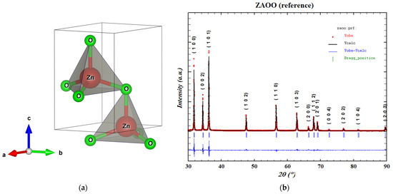 A typical unit cell representation of this direct bandgap semiconductor [31] can be seen in Figure 3a, while a Fullprof fitting example for the ZAOO reference sample (including the crystallographic planes) can be observed in Figure 3b. The peak fitting parameters used for the Rietveld refinement in all cases were the following: background, atomic parameters (Z, B, Occ), and profile parameters (Factors, Cell Parameters, FWHM/Shape Parameters). The wurtzite structure representative for ZnO consists of two interpenetrating hexagonal close packed (hcp) sublattices of Zn and O cations and anions, respectively, displaced by the length of a cation–anion bond in the c-direction. Each sublattice includes four atoms per unit cell, and every atom of one type (group II atom) is surrounded by four atoms of the other type (group VI) or vice versa, which are coordinated at the edges of a tetrahedron. In an ideal wurtzite structure, the c/a ratio is 1.633 [7]. From the column 3 of Table 1, it is obvious that the c/a ratio of our real ZnO based samples is slightly smaller than that of the ideal structure, most probably due to the different imperfections found in the actual crystal lattice.