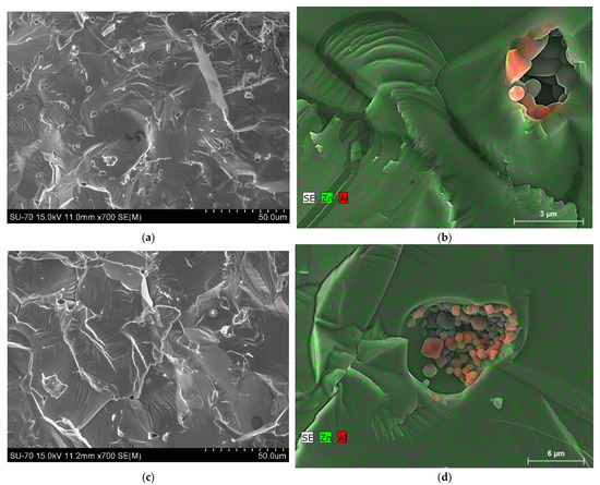While in the case of Al2O3 precursor (ZAOO sample) the remaining Al2O3 particles are integrated into the pore walls (Figure 4f), the remaining Al rich particles appear detached and fill in the pore volume, as in the case of the microZAO sample (Figure 4d), or are simply sintered together, in the case of nanoZAO (Figure 4a). These differences in morphology may originate from the local overheating effects taking place during the aluminothermic reaction of aluminium with zinc oxide (see Equation (1)), considering the different morphologies of the Al precursors seen in Figure 5.