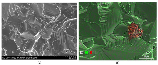 Representative SEM micrographs (a,c,e) and EDS maps (b,d,f) of the transversal fractures of nanoZAO (a,b), microZAO (c,d), and the reference ZAOO (e,f) samples.