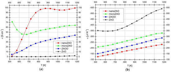 Both samples prepared using metallic Al precursor show notably higher electrical conductivity compared to the conventionally prepared ZAOO sample. At 800–850 K, more than a 3-fold increase in conductivity is observed for the nanoZAO sample. This improvement appears counterintuitive when analysing these results together with the microstructural data. The images from Figure 4a,d, which represent a general picture found for these samples, suggest that a significant part of the aluminium precursor may actually remain unreacted, decreasing the actual doping level. The density improvement from 92 to 96% in the samples prepared via aluminothermic reaction is not sufficient to explain such a significant boost of the electrical conductivity. A plausible explanation is that local and strongly exothermic aluminothermic reactions promote the incorporation of aluminium into the wurtzite structure by the substitutional mechanism, resulting in the generation of additional charge carriers. At the same time, while using the conventional process for the ZAOO sample, part of the aluminium can be incorporated as interstitials and/or the formation of ZnAl2O4 spinel might occur [16]. Due to the low nominal aluminium concentration and the absence of additional components which promote the spinel formation [16], it was not possible to detect its presence in any amounts for the discussed samples.