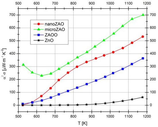 Some additional guidelines on the relevant mechanisms behind the observed boosting of the electrical conductivity in the samples processed using metallic Al can be obtained from the Seebeck coefficient results (Figure 6b). The thermopower decreases for nanoZAO sample as compared to ZAOO, suggesting that, most probably, the observed conductivity enhancement is linked to an increase of the charge carrier concentration. However, the microZAO sample surprisingly shows the highest Seebeck coefficient (not considering the pure, undoped ZnO), and the reasons for that are still to be understood. It is very likely that aluminothermic-boosted sintering might also enhance the mobility of the charge carriers. More detailed studies of the microstructure by HRTEM and Hall effect measurements are required to prove or reject this hypothesis. In any case, the observed results show that a significant improvement in electrical contribution to the TE performance can be achieved if metallic aluminium precursor is used instead of conventional Al2O3. The latter is well-illustrated by the power factor values presented in Figure 7. A maximum enhancement of the power factor was achieved for the microZAO samples, due to a simultaneous increase in the electrical conductivity and Seebeck coefficient values.