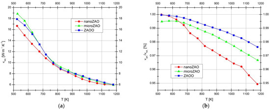 The thermal conductivity data is presented in Figure 8. Minor variations of the thermal conductivity with the composition are expected, since the samples have similar and relatively low dopant contents, while their microstructures were also mostly similar. The electronic contribution to the thermal conductivity is below 5%, indicating that a major part of the heat is transferred by the phonons. Although the difference is almost within the experimental error, the lowest thermal conductivity at 500–750 K was observed for the nanoZAO sample, indicating that some additional phonon scattering contributions might actually be provided, due to the use of the nanometric-scale Al powder as a precursor.