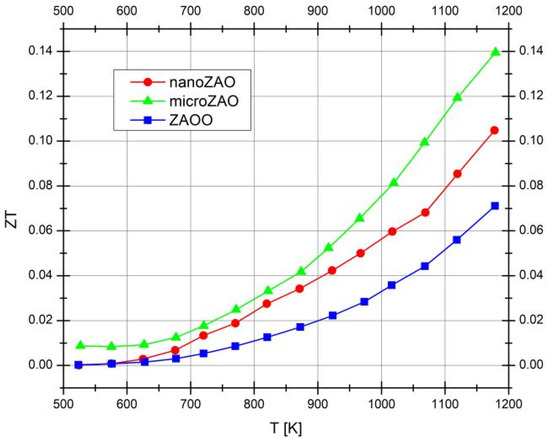 Finally, the combined effect of the electrical and thermal transport properties on the overall TE performance is illustrated by the temperature-dependence of the dimensionless figure of merit shown in Figure 9. The most notable enhancement reaching ZT of 0.14 at 1173 K was observed for the microZAO sample. The overall improvement of the ZT in nanoZAO and microZAO samples is mainly linked to electrical performance. This first evidence of how aluminothermic reactions can be involved in the processing of TEs based on zinc oxide, however, leaves several important questions unanswered regarding the relevant mechanisms behind the observed effects.