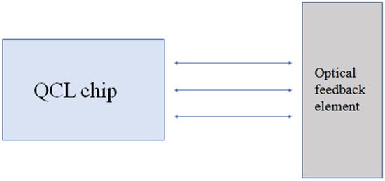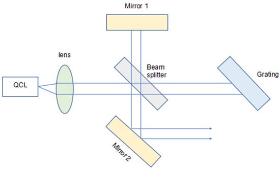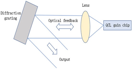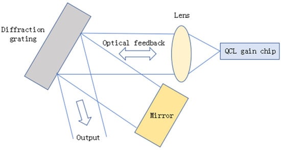 The basic structure of ECQCLs is usually composed of a laser external cavity and optical feedback elements, such as collimating lenses and wavelength selectors. The wavelength selectors can be a diffraction grating, a photoelectric filter, an acousto-optic filter, etc., and the laser is enhanced through the feedback of the selectors. The spectrum can be reflected by rotating the angle of the grating; thereby, the laser emission wavelength can be adjusted. The basic structure of an ECQCL is shown in Figure 1.
