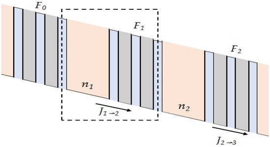 Energy diagram of three well structures of QCL(current densities Jm, electron densities nm and fields Fm, module number m).