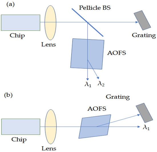 Two tunable structures of ECQCL: (a) ECQCL with extra-cavity AOFS, (b) ECQCL with intra-cavity AOFS. BS: Beam splitter.