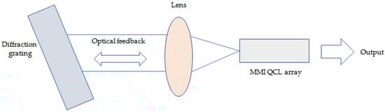 For a single-mode laser, an excellent choice for beam splitting is the MMI [14,15], which has long been used for near-infrared beam splitting, with high splitting efficiency. The MMI structure of an ECQCL is shown in Figure 7. The MMI QCL array is collimated by collimating lens. The collimated beam is diffracted on the grating. The first-order diffracted beam is fed back to the MMI QCL array for mode selection. Wavelength tuning is achieved by changing the placement angle of the grating.