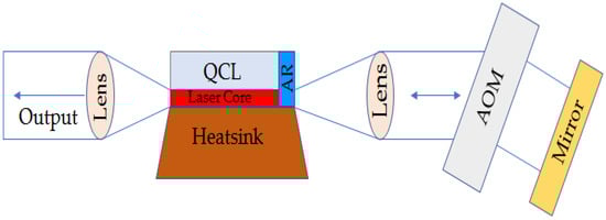 In 2019, Arkadiy Lyakh et al. [17] reported a new structure that combined AOM tuning with heterogeneous QCL, with the goal of developing a laser source for ultrafast tuning in a broad infrared spectral region. The tunable range of the laser was from 1990 cm−1 to 2250 cm−1, and the schematic diagram is shown in Figure 8.