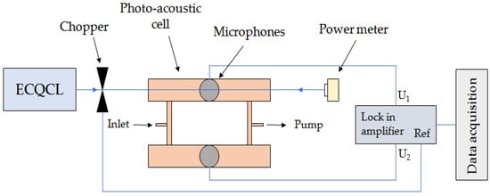 In 2013, D. Mammez et al. [25] reported the commercialization of an ECQCL in a photoacoustic spectrometer with an emission wavelength of 10.5 μm. The spectrometer could measure in a wide spectral range of 60 cm−1, which means that the spectra of complex molecules as well as the entire absorption bands of small molecules could be recorded. The wide tuning range of this photoacoustic spectrometer light source demonstrates the possibility of detecting complex small molecules such as CO2 and C4H10. Figure 9 shows the structure diagram of spectral detection.