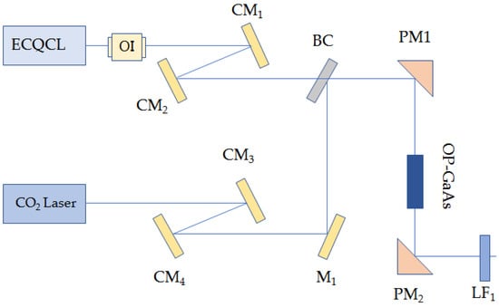 In 2020, Mohammad Khaled Shakfa et al. [35] reported a new mid-infrared laser diagnostic instrument for C6H6 measurement. The structure is shown in Figure 10, and this instrument consisted of an ECQCL and a CO2 gas laser, directional patterned GaAs crystal. The laser system emitted a laser that ranged from 12.64 μm to 15 μm in the mid-infrared region. The laser was tuned to the Q-branch transition peak around 14.838 μm, and it showed that the cross section of C6H6 was very sensitive to pressure. Experiments were carried out after reflecting the shock wave to determine the absorption cross section of C6H6 at 553–1473 K and 1.17–2.48 bar. This new detection method was been confirmed in the reaction shock tube experiment of propargyl iodide to C6H6.