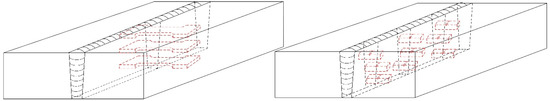 During the tandem narrow-gap welding process, the two wires were controlled independently by two CLOOS 503 power sources. As shown in Figure 1, the ends of the two contact tips were bent to direct the two wires toward the opposite sidewalls to ensure sufficient sidewall penetration, and the bending angle was 7°. The distance between the two wires was 8 mm, and the two arcs were attached to one single molten pool.