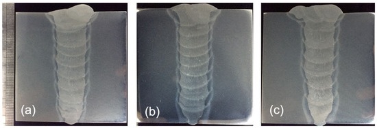 Cross-sections of the narrow-gap GMA welded joints under different welding speeds: (a) 350 mm/min; (b) 300 mm/min; (c) 250 mm/min.