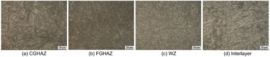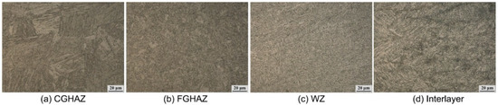 The microstructure of the typical zone of the welded joint is shown in Figure 8. It can be seen that the weld zone is composed of AF; the microstructure of CG-HAZ is still mainly lath martensite (LM), but the grain size significantly decreases compared with that of tandem welding.