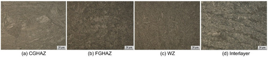 Microstructure of the welded joint with the welding speed of 250 mm/min. (a) coarse-grain heat-affected zone; (b) fine-grain heat-affected zone; (c) weld zone; (d) interlayer zone.