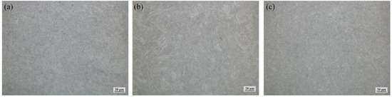 Generally, martensite, bainite, and ferrite exist in the low carbon micro-alloyed system, and Q690 grade TMCP steels belong to this alloy system [27]. In addition, these kinds of phases could be distinguished through morphological features by optical microscope [28]. Figure 4, Figure 5 and Figure 6 show the microstructure of the typical zones in the welded joints. Welded joints mainly include the base metal zone, heat-affected zone (HAZ), and weld zone (WZ). The heat-affected zone contains the coarse-grain zone (CG-HAZ) and fine-grain zone (FG-HAZ). The weld zone also contains the interlayer zone. Different regions present different microstructures. The microstructure of CG-HAZ is mainly lath martensite (LM); the microstructure of FG-HAZ is finer granular bainite (GB); the microstructure of WZ is acicular ferrite (AF) and a small amount of granular bainite (GB); the microstructure of the interlayer in the WZ contains acicular ferrite (AF), lath bainite (LB), and granular bainite (GB) in the original austenite grain, and fine secondary austenite decompositions along the grain boundaries of the original austenite grain.