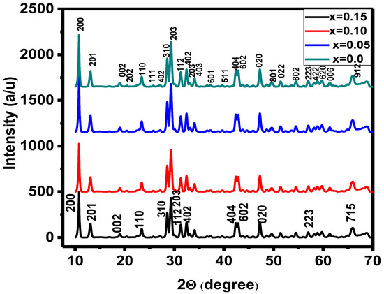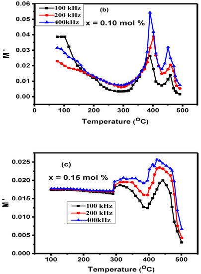 Figure 7. It was shown that M′ decreased with temperature up to a certain temperature, and then it increased again with temperature, resulting in peaks at different temperatures. The values of M′ at 400 kHz for all doped samples were higher in almost the entire temperature range. In the higher temperature range, we observed one peak of M′ for the x = 0.05- and 0.15-doped samples, and double peaks were observed for the x = 0.10-doped samples. As shown in the dielectric plot in