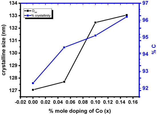 Dhkl denotes the crystalline size, k denotes a dimension free-form factor with a value near unity (0.9), λ is the Cu Kα1 X-ray wavelength, β is the line broadening (FWHM), and θ is the Bragg angle. The grain size was measured along the (200) peak and found to increase with the amount of Co in the ceramics. Because of the difference in ionic radii between Co2+ and Ti4+ ions, it was also expected that Co: K2Ti6O13 would be formed with a large crystalline size due to more agglomeration.