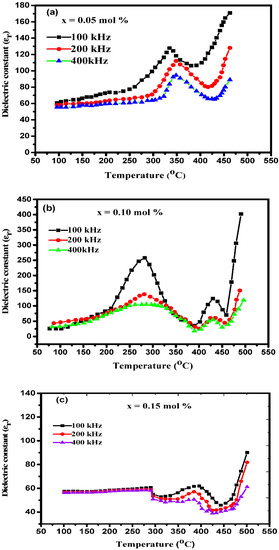 13 ceramics with temperature at frequencies of 100, 200, and 400 kHz. It can be seen that the dielectric constant rose with temperature up to a certain critical temperature and then started decreasing with a further increase in temperature. The Curie transition (T