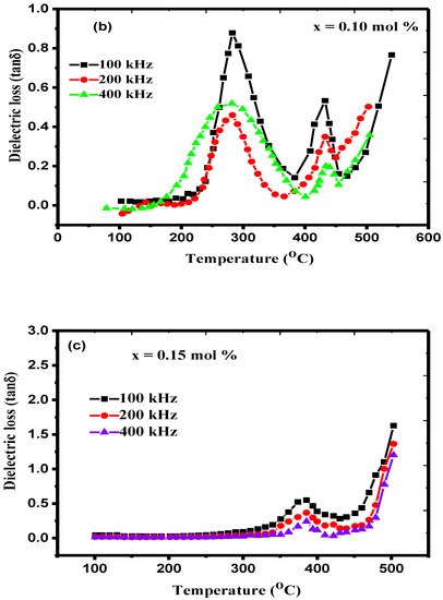 13 were observed at temperatures of 335 °C, 340 °C, and 347 °C for 100 kHz, 200 kHz, and 400 kHz, respectively. Herein, the tangent loss peak was moved to a higher temperature, and loss was reduced with increasing frequency, exhibiting ferroelectric relaxation that could be assigned to a reduction in the relaxation time with temperature [