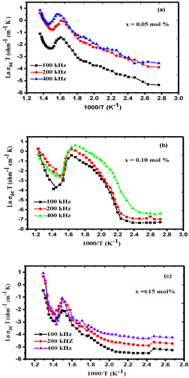 σac) with temperature in the range of 100–500 °C for the frequencies of 100, 200, and 400 kHz. All samples have slightly unusual patterns of ac thermal behavior. On the basis of this behavior, the trend may be divided into four regions for analysis. The activation energy could be determined in different regions using Arrhenius equations [
