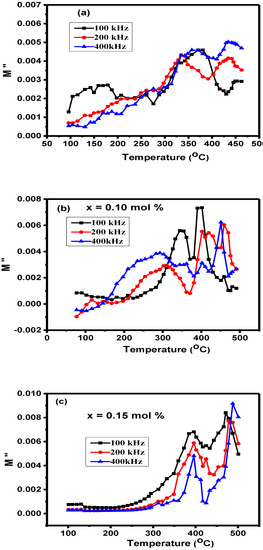 Figure 8 shows the variation of the imaginary portion of the electrical modulus (M′′) with temperature at 100 kHz, 200 kHz, and 400 kHz. It was observed that values of M′′ at lower temperatures were lower, and they initially increased with temperature and then decreased, following the exhibition of peaks at higher temperatures. The values of M′′ at frequencies of 100 kHz, 200 kHz, and 400 kHz were almost the same for the whole temperature range. M′′ started increasing with temperature at lower temperatures for samples x = 0.05 and x = 0.10, whereas it was almost constant up to 225 °C for x = 0.15.