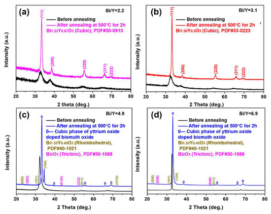 Yttria-doped bismuth oxide (YSB) films with various atomic ratio of Bi/Y in a range of 2.2–6.9 were deposited through DC reactive magnetron sputtering technology. The value of atomic ratio of Bi/Y was obtained by EDX analysis. The atomic ratio was controlled by adjusting the power discharge of the Bi target and fixing the power of the Y target on 300 W. The deposition parameters are given in Table 1. The correlation between the power discharge of the Bi target and atomic ratio of Bi/Y as well as deposition rate are shown in Figure 2. As shown, the relationship between the atomic ratio of Bi/Y, as well as the deposition rate and the power of the Bi target, follows a non-linear trend. This is attributed to the increased sputtering rate of the target surface at high sputtering power. As the power of the Bi target increases, both the atomic ratio of Bi/Y and the deposition rate increase significantly, and the trend becomes more obvious. The films with different atomic ratios of Bi/Y (2.2, 3.1, 4.9, and 6.9) were obtained by adjusting the discharge power of the Bi target. The as-deposited films were amorphous-nanocrystalline. Thus, a post-annealing treatment at 500 °C under the air was necessary to obtain the crystallized phase. XRD measurement was used to confirm the phase information of the thin films. It can be seen from Figure 3a,b that the films have pure phases corresponding to Bi1.33Y0.67O3 and Bi1.5Y0.5O3 when the atomic ratio of Bi/Y are 2.2 and 3.1, respectively. It is more obvious especially after the annealing treatment at 500 °C. However, the situation changes when Bi/Y is higher, as shown in Figure 3c,d. A YSB main phase is believed to exhibit in Figure 3c,d, while two trace phases, Bi1.55Y0.45O3 and Bi2O3, are also observed after the annealing treatment at 500 °C. In addition, the films before annealing have a vitreous or even slightly columnar appearance which is accentuated with annealing (Figure 4). This change in morphology is in agreement with X-ray diffraction measurements (Figure 3), which revealed an increase in crystallization with annealing.