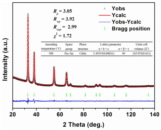 The XRD characterization and profile matching of the Bi1.5Y0.5O3 film of 1.72 μm deposited on glass after annealing at 500 °C for 2 h.