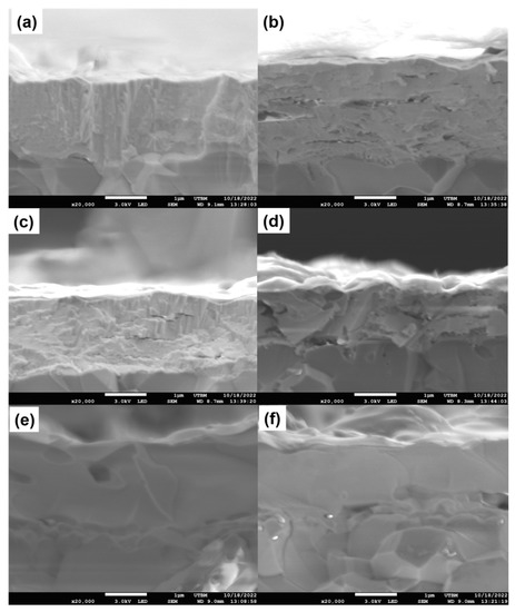FESEM characterizes of the brittle fracture cross-section of the Bi1.5Y0.5O3 films deposited on alumina plate varies with the different annealing temperature of (a) as deposited, (b) 400 °C, (c) 500 °C, (d) 600 °C, (e) 700 °C, (f) 800 °C.