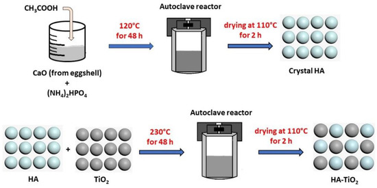 Composites were prepared by mixing HA and TiO2 (Anatase, 99.0%, Merck, Kenilworth, NJ, USA) with various weight variations, namely HA:TiO2 with ratios of 30:70 (H3T7), 40:60 (H4T6), 50:50 (H5T5), 60:40 (H6T4), and 70:30 (H7T3). The mixture was dispersed and stirred with 60 mL of deionized water using a magnetic stirrer, then put into a 100 mL autoclave, and then heated at 230 °C for 48 h to obtain a HA-TiO2 composite [14,43]. The prepared synthesis process for HA-TiO2 crystals is shown in Figure 1.
