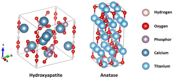 The HA crystal from the synthesized composite had a smaller lattice volume as the amount of TiO2 was added (Table 3). This indicates that TiO2 causes shrinkage of the lattice volume of HA. This phenomenon complies with another study we found demonstrating that the presence of TiO2 can decrease the length of the lattice constant in the c direction [32]. The smallest HA lattice volume was obtained on the H3T7 composite with a volume of 528.211 Å3. In addition, in the anatase TiO2, the smallest lattice volume value is also shown in the H3T7 composite, which means that the small amount of TiO2 gives the effect of decreasing the lattice volume. The volume of the TiO2 anatase lattice in the H3T7 composite is 135.834 Å3. The crystal structure of HA and anatase TiO2 was shown in Figure 3.