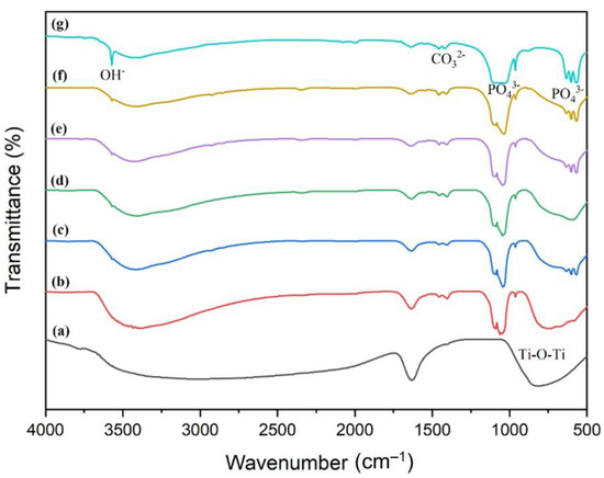 Infrared spectra of (a) TiO2; (b) H3T7; (c) H4T6; (d) H5I; (e) H6T4; (f) H7T3; and (g) HA.