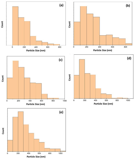 Particle size distribution from SEM image using ImageJ 1.52a software of (a) H3T7; (b) H4T6; (c) H5T5; (d) H6T4; and (e) H7T3.