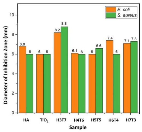 The results obtained from this antibacterial test are inhibitory diameter which can be seen in Figure 7. The inhibition zone showed bactericidal activity on the Gram-positive bacteria (S. aureus) and Gram-negative bacteria (E. coli). The highest inhibition zone is found in the H3T7 composite, where Gram-positive bacteria are more extensive than Gram-negative bacteria. These results correspond to previous studies that reported that the antibacterial activity of the HA-TiO2 composite is more pronounced against Gram-positive bacteria due to the plasmolysis of the cell wall or the separation of the cytoplasm from the cell wall [40]. Some studies have reported that Gram-negative bacteria are usually more resistant. This resistance is associated with the cell walls of Gram-negative bacteria that are more complex than those of Gram-Positive bacteria. However, under certain conditions, Gram-negative bacteria can be more resistant to chemical agents than to Gram-positive bacterial cells [67,68]. Another reason is that the external membrane of Gram-negative bacteria consists mainly of a strong layer of lipopolysaccharides, which are considered a barrier. Thus, Gram-positive bacteria have a high sensitivity due to differences in the composition of their cell walls compared to Gram-negative bacteria [69,70]. The antibacterial test image can be seen in Figure S4.